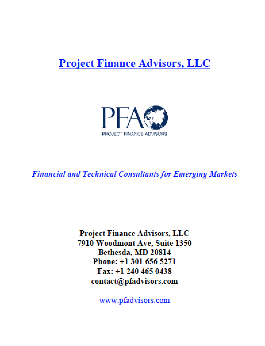 Project Finance Advisors is a technical and financial consulting firm specializing in advising clients about how best to structure domestic and overseas projects for commercial bank debt, multilateral and bilateral institutional support, equity fund investment and credit enhancement. PFA has special expertise in emerging markets in Russia, the former Soviet Union and Central Asia, the Caucasus, Eastern Europe, Africa, Latin America and Asia.